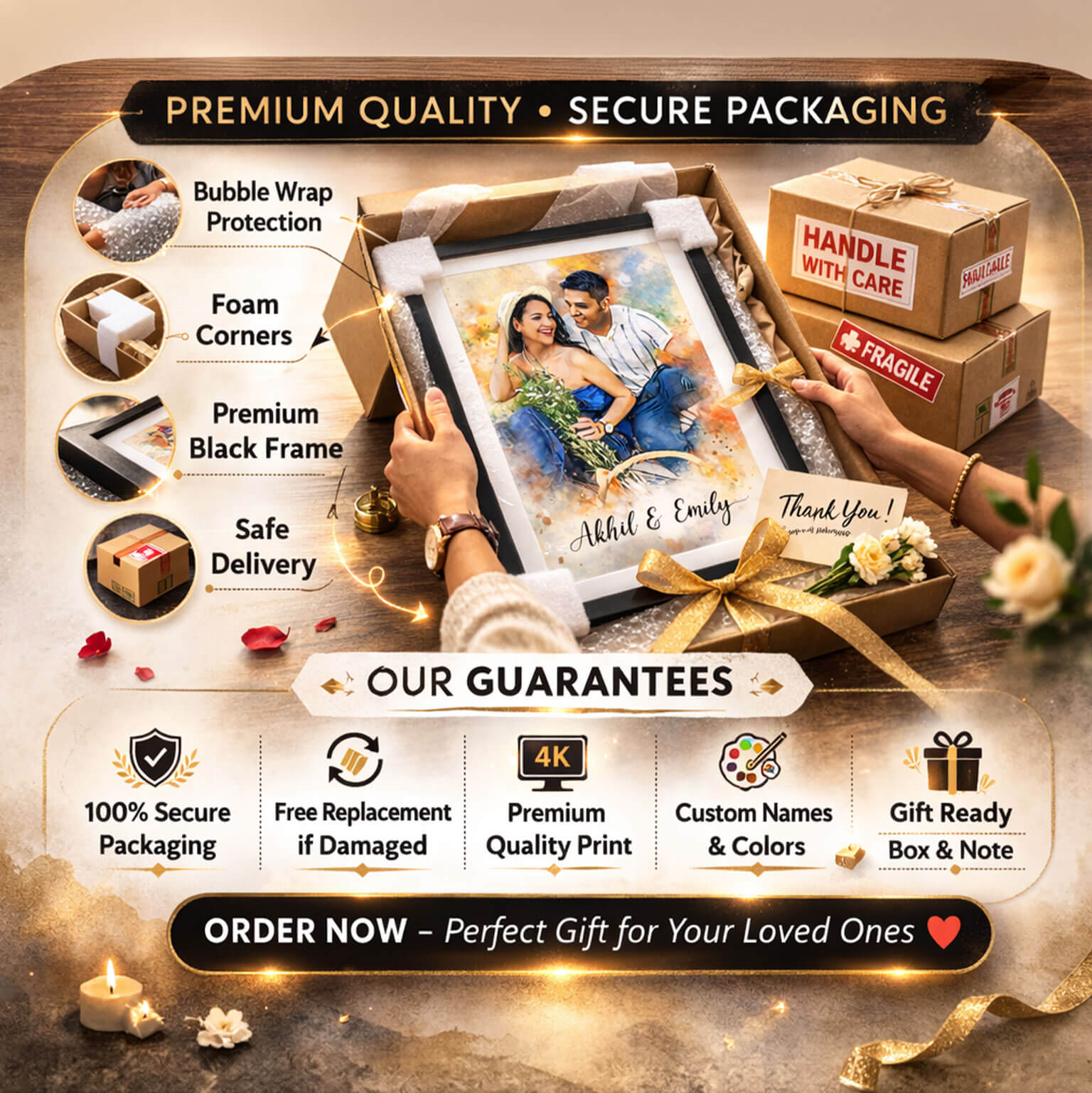 We transform any image of your choice into a stunning watercolor painting and print it in on luster matt 255 gsm paper and Framed with engineered wood frame Print so that you can proudly display it in your home or give it as a thoughtful and unique gift. You can even add custom quotes and messages to make the artwork truly yours! It's perfect for couples who are celebrating their wedding anniversary or other special occasions.